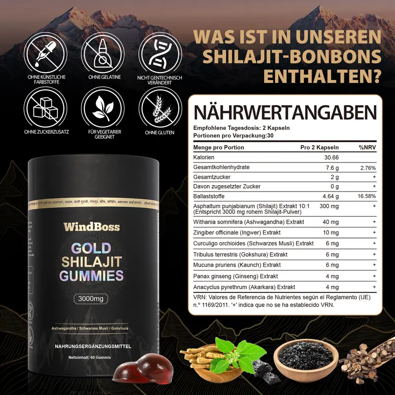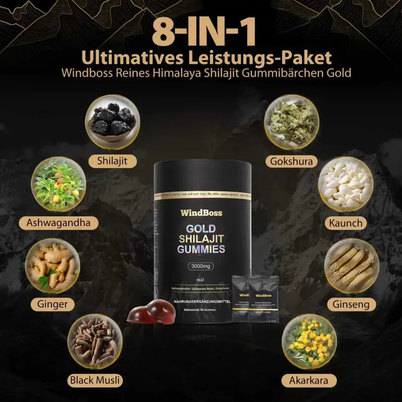 WindBoss Shilajit Himalaya-Gummibarchen sind inspiriert von alten Traditionen. Jede Gummibarche kombiniert Shilajit mit Ashwagandha und Schwarzem Musl. Natürliche Inhaltsstoffe für Ihren Alltag.